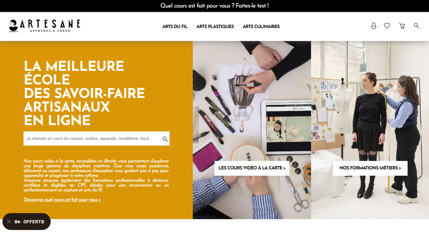 Le site Artesane.com est une plateforme en ligne dédiée aux cours créatifs et aux contenus autour des loisirs créatifs et de l’artisanat. Il propose notamment des formations et des contenus dans différents domaines créatifs accessibles aux utilisateurs via abonnement ou achat.