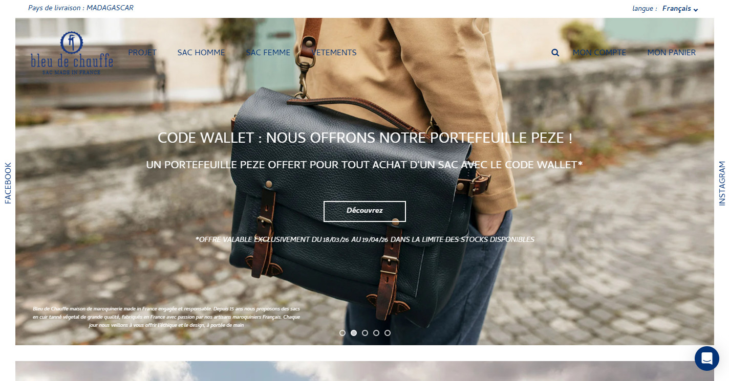 Le site bleu-de-chauffe.com est une boutique en ligne spécialisée dans la fabrication et la vente d’articles de maroquinerie et d’accessoires, notamment des sacs et articles de voyage. Les produits sont proposés à la vente en ligne avec livraison en France et à l’international.