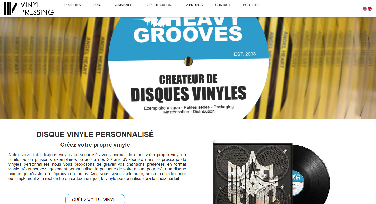 Le site vinyl-pressing.com est une boutique en ligne spécialisée dans la fabrication de vinyles personnalisés et le pressage de disques en petites séries. Il propose des services de création de disques vinyles sur mesure, accessibles sans quantité minimale, avec une livraison possible en France et à l’international.